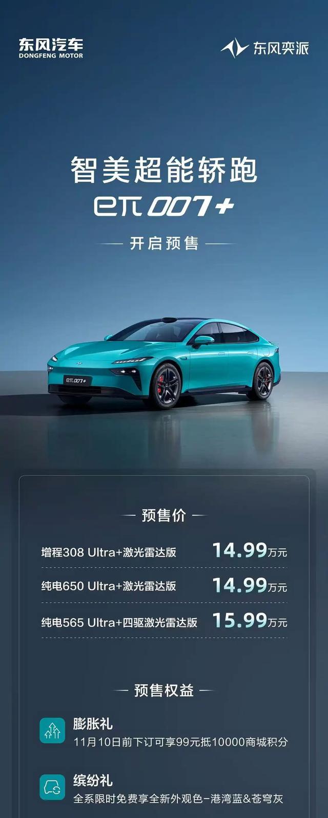 11月2日,东风奕派eπ007+正式开启预售,新车共推出3款车型,其中1款增程,2款纯电,预售价区间为14.99-15.99万元。另外,现在订车还可享受三重权益,分别是膨胀礼、缤纷礼和安心礼,具体可看下图。