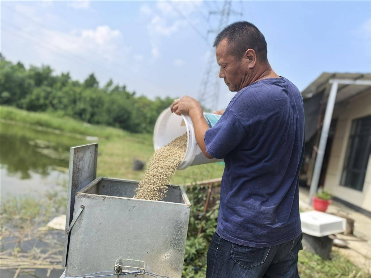 李忠章在投喂鱼饲料。湖北日报全媒记者 胡祎 摄